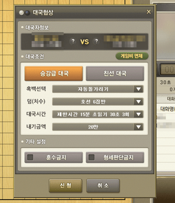 - 제한시간을 속기로 설정하거나 치수를 고칠 경우 ‘친선대국’으로 설정되어 전적에 반영되지 않음