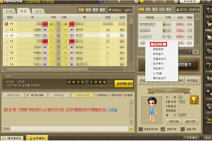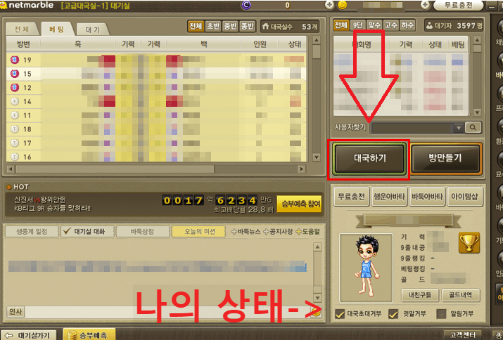대기실 우측 중앙에 '자동대국신청'버튼을 이용하면 자신과 같은 급수인 회원들에게 대국신청 메시지가 보내집니다.