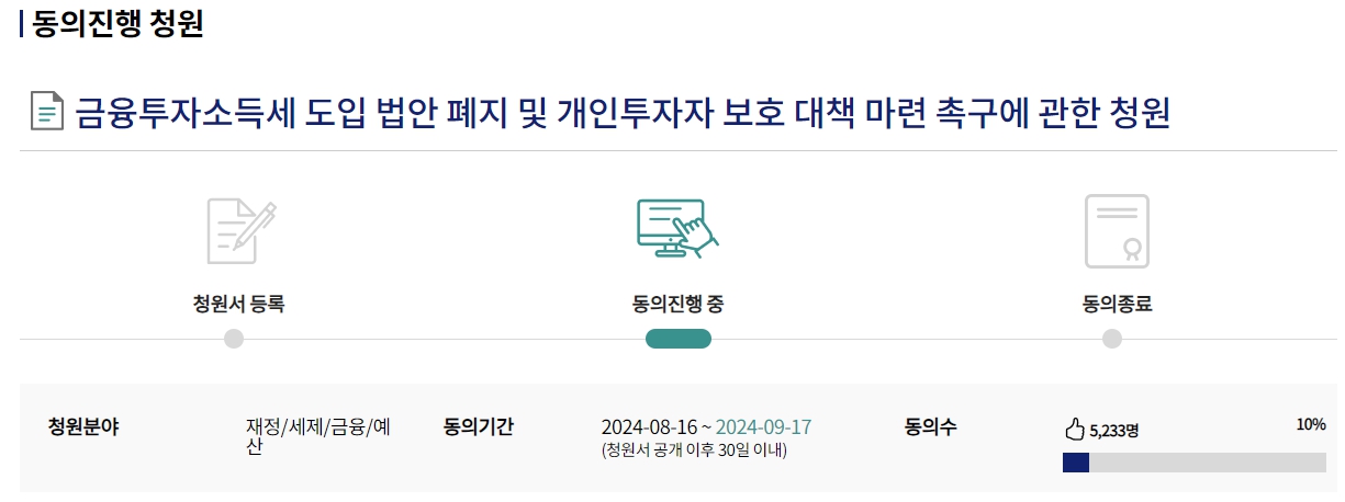 경제적 자유를 위해 주식투자는 필수인데요. 우리나라에 곧 시행될 수 있는 금융투자소비세 (금투세)로 인하여 주식시장이 불안해 지고 있습니다. 2024년 9월 17일(화)까지 진행중인 금융투자소비세 반대 국민청원을 신청해 주세요.