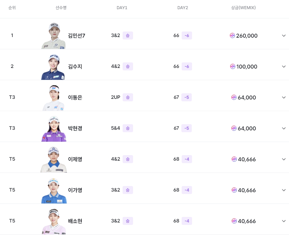 이번 대회는 KLPGA 투어 위믹스 포인트 상위 24인의 정예들이 출전한 특별한 이벤트였습니다. 첫날은 매치플레이, 둘째 날은 스트로크 플레이라는 독특한 포맷으로 진행되었으며, 1라운드 매치플레이 결과에 따라 승자 그룹은 파이널 A, 패자 그룹은 파이널 B로 나뉘어 경쟁을 이어갔습니다.